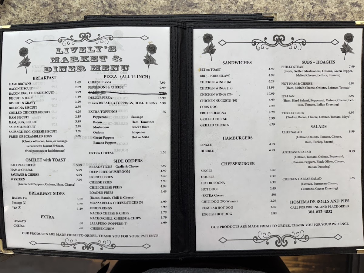 At Lively's Market And Diner Menu, you'll find a delightful mix of hearty classics and comforting favorites that will make any meal memorable. Located at 22637 Turnpike Rd, Belva, WV, this charming diner serves up everything from sizzling breakfast platters to satisfying lunch and dinner options. Whether you're craving a savory omelet to kickstart your day or a juicy burger for lunch, there's something for everyone. Their home-cooked meals, made with fresh, quality ingredients, ensure a fulfilling experience every time you visit. With a warm, welcoming atmosphere, Lively’s is perfect for both quick bites or a relaxing meal with family and friends. You won’t want to miss out on their signature dishes, which have earned them a loyal following.